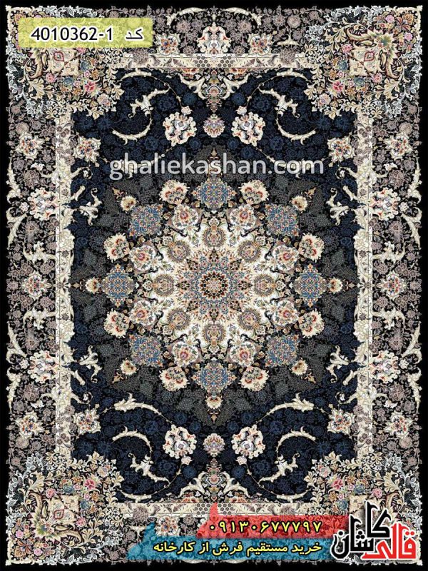 مشخصات فرش 1200 شانه طرح ترنج زمینه سرمه ای کاشان