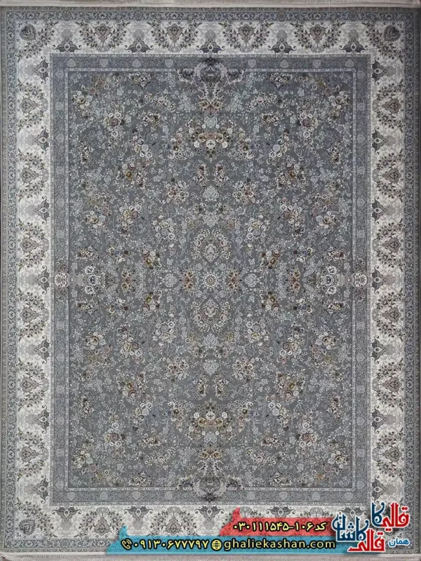 مشخصات فرش 1500 شانه طرح افشان دلاریس رنگ طوسی گل برجسته کاشان
