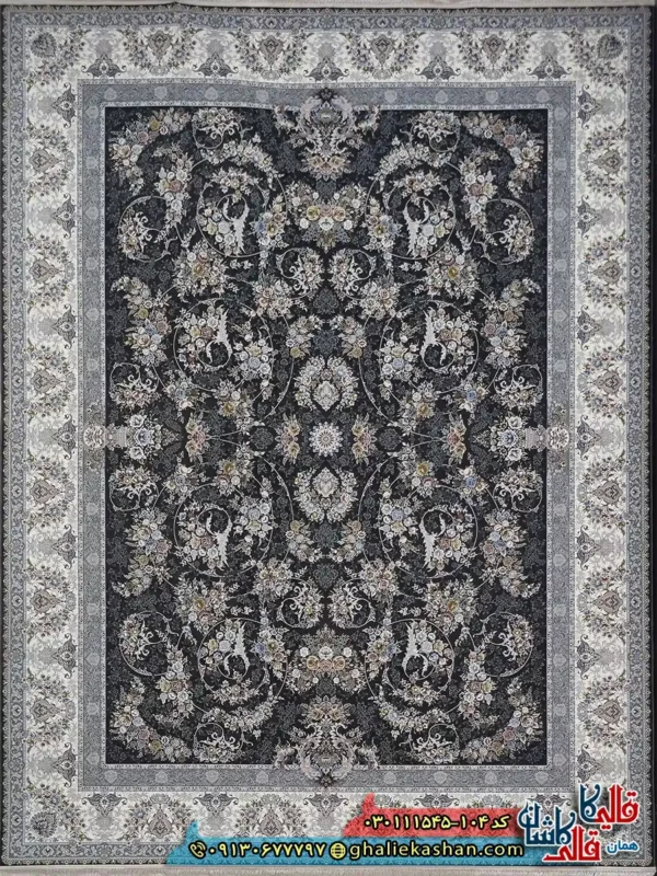 مشخصات فرش 1500 شانه طرح افشان دلاریس رنگ مشکی زغالی گل برجسته کاشان
