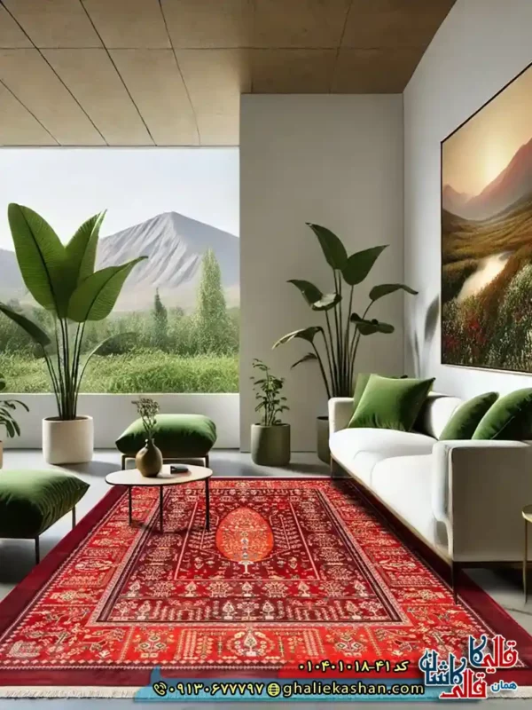 مرکز این فرش ماشینی پر از زندگی است ؛‌ درختی بلند و با شکوه که مانند داستانی قدیمی ،‌ شاخه ‌هایش تا دل طرح کشیده شده ‌اند .‌ دور تا دور آن پر از درختچه ‌ها و نقش ‌های سنتی ریز و ظریف است که حس آرامش و نظم خاصی را منتقل می ‌کنند .‌ رنگ عنابی زمینه ،‌ با ترکیب نقش ‌های کرم و طلایی ،‌ جلوه ‌ای گرم و دل ‌نشین ایجاد کرده است .‌ این فرش کلاسیک کاشان با هر دکوراسیونی که در آن حسی سنتی یا تلفیقی وجود دارد ،‌ هماهنگی فوق ‌العاده ‌ای دارد ؛‌ به ‌ویژه در کنار مبلمان روشن یا وسایل چوبی .‌