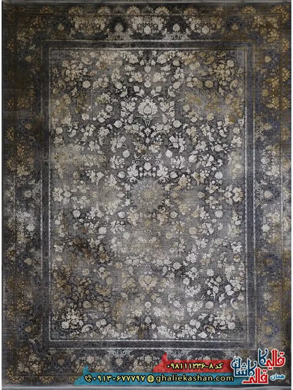 قالی کاشان | فرش کاشان فرش 1200 شانه کاشان فرش طلاکوب وینتیج 1200 شانه طرح افشان شاه پسند رنگ طوسی دودی گل برجسته کاشان