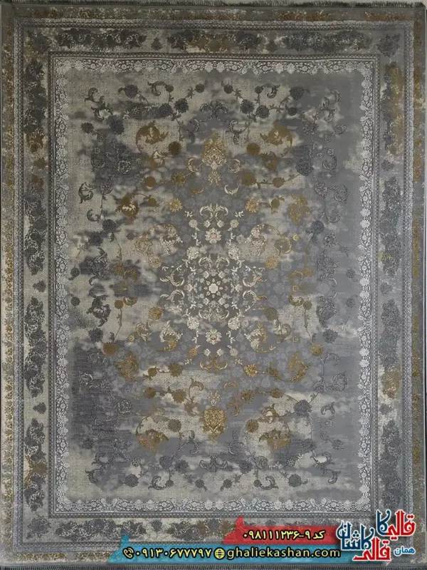 نقد و بررسی فرش طلاکوب وینتیج 1200 شانه طرح افشان قصر رنگ طوسی نقره ای گل برجسته کاشان