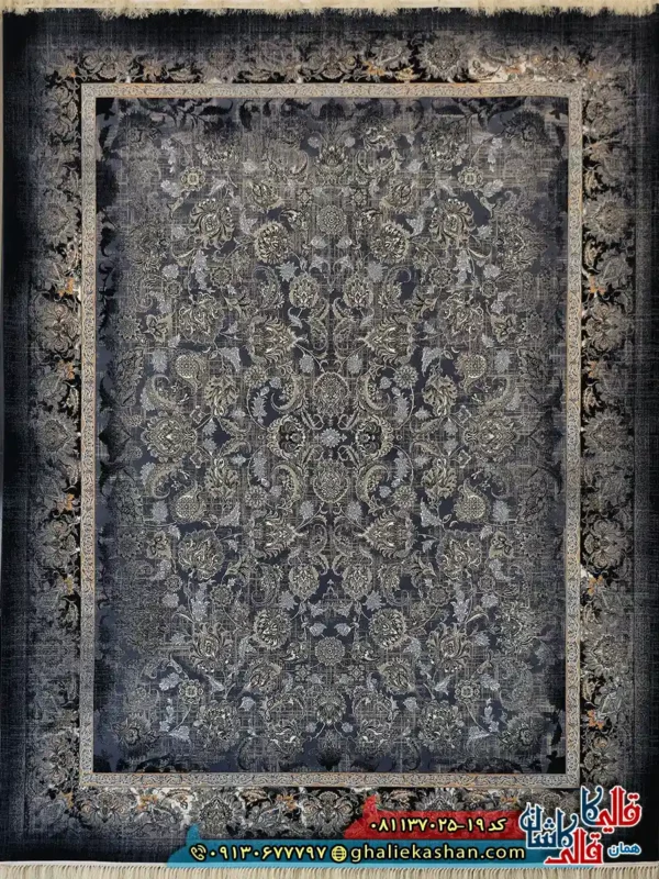 1. فرش طلاکوب وینتیج 700 شانه طرح افشان کیمیا رنگ سرمه ای کاشان حاشیه