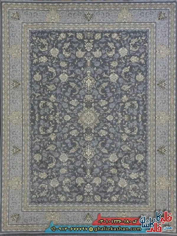 مشخصات فرش طلاکوب 1200 شانه طرح افشان دلوین رنگ طوسی کاشان