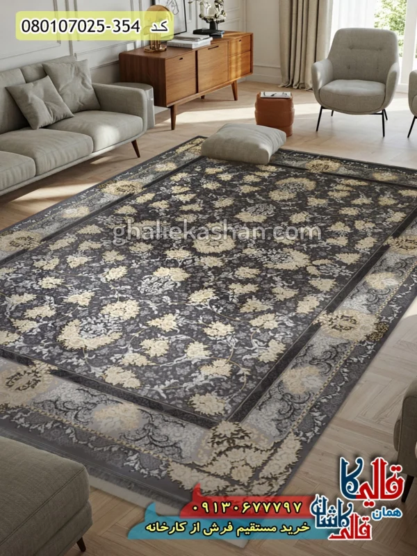 4. فرش طلاکوب 700 شانه طرح افشان نورا زمینه طوسی دودی کاشان نزدیک