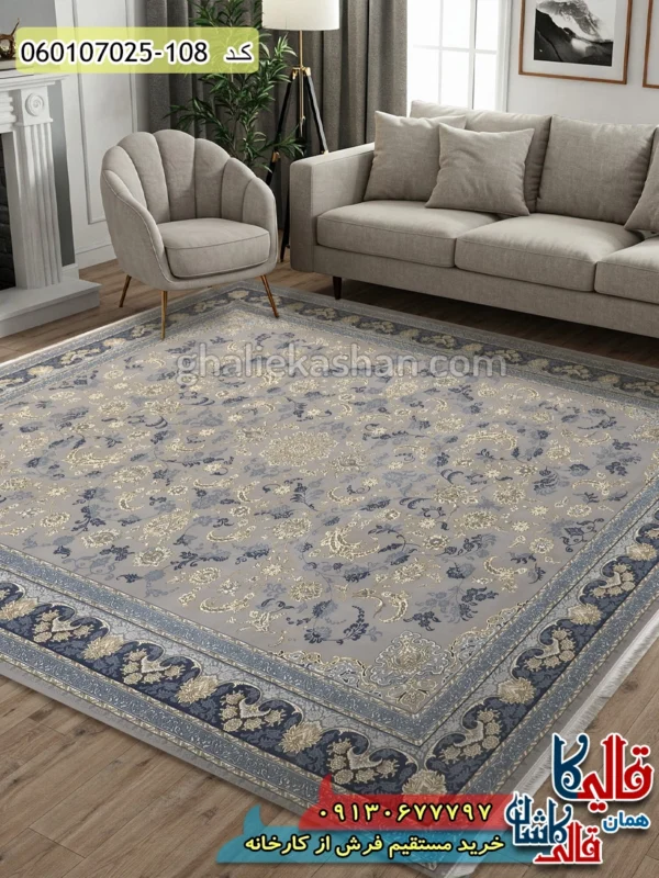 4. فرش طلاکوب 700 شانه طرح افشان نیلی زمینه فیلی ترمه ای کاشان نزدیک