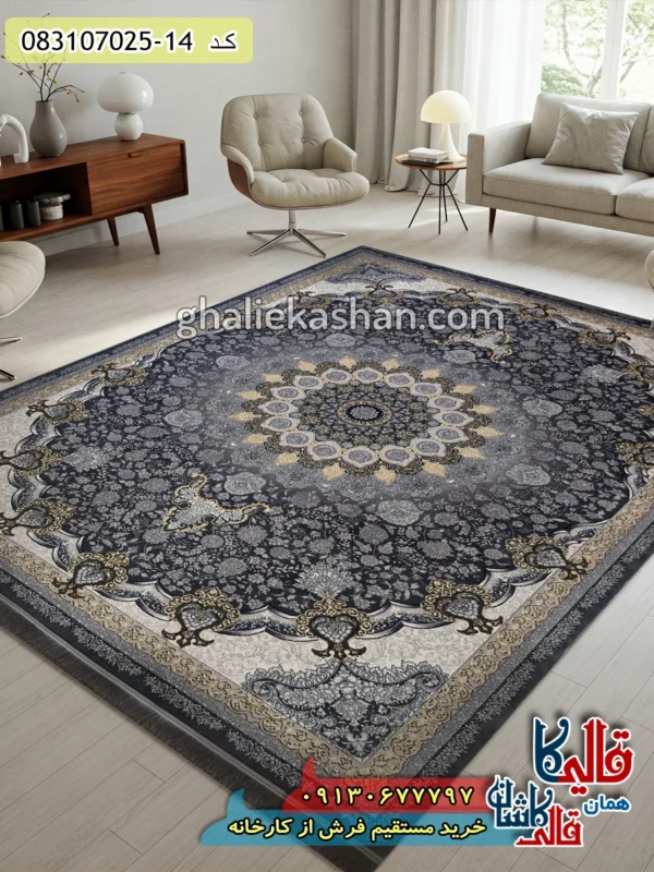 چیزی که اول از همه در این فرش جلب توجه میکند ، زمینه طوسی دودی جذاب آن است . این رنگ به راحتی با مبلمان روشن یا حتی تیره ست می شود و جلوه ای بسیار شیک به فضا میدهد . وسط فرش یک ترنج دایره ای قرار دارد که با گل های شاه عباسی و گلدانی پر از جزئیات است . ترکیب رنگ طلایی و نقره ای هم در حاشیه و هم در مرکز فرش کار شده و همین موضوع باعث شده فرش حالت لوکس و متفاوتی پیدا کند . چون نقشه فرش شلوغ و پرجزئیات است ، برای سالن های بزرگ یا پذیرایی انتخاب بسیار مناسبی است و به فضا گرمی و شکوه خاصی می دهد .
