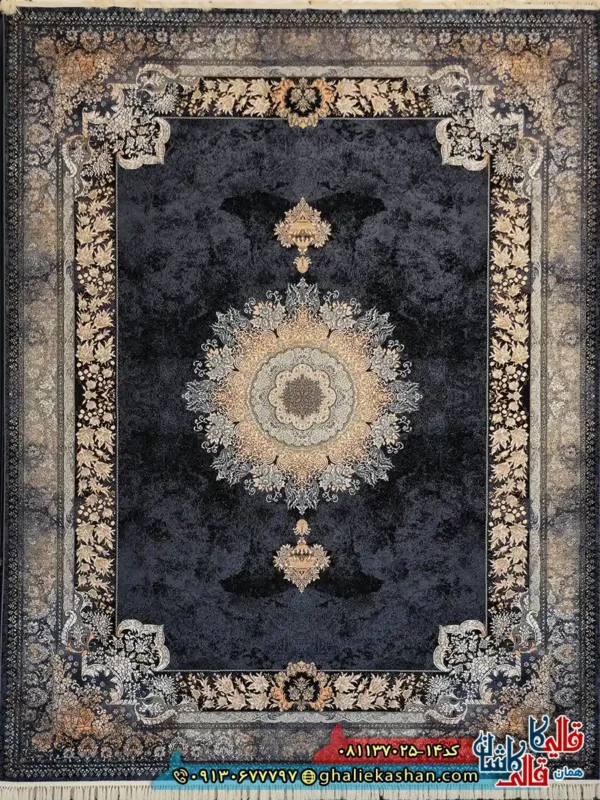 فرش طلاکوب 700 شانه طرح شاهکار رنگ سرمه ای کاشان