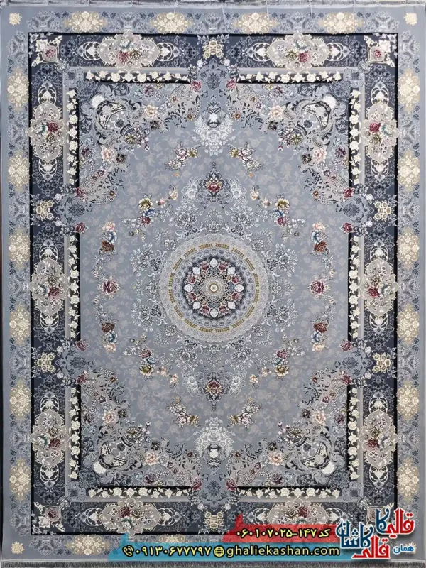 قالی کاشان | فرش کاشان فرش کلاسیک فرش طلاکوب 700 شانه طرح گندم رنگ طوسی نقره ای کاشان
