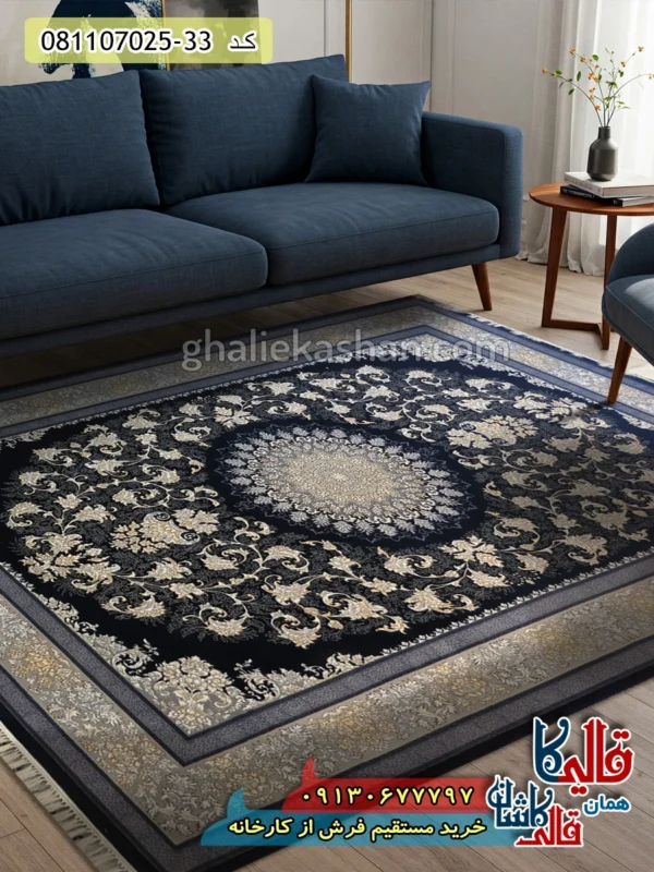 قالی کاشان | فرش کاشان فرش 700 شانه کاشان فرش طلاکوب 700 شانه طرح یلدا رنگ سرمه ای کاشان