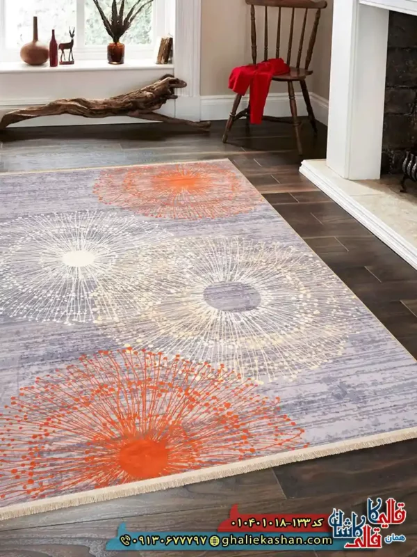 اولین چیزی که در نگاه اول توجه شما را جلب می کند ، طرح خاص و متفاوت آن است . قاصدک های بزرگ نارنجی و سفید روی زمینه ی طوسی ، حس لطافت ، تازگی و انرژی مثبت خاصی به فضا می دهند . گویی نسیم ملایمی در حال حرکت دادن قاصدک ها بر سطح فرش است . این ترکیب رنگی هوشمندانه باعث می شود فضا هم آرام تر و هم دلنشین تر به نظر برسد . فرش افشان مدرن کاشان در دکورهای روشن ، به ویژه در کنار مبلمان سفید ، نارنجی یا طوسی ، جلوه ی بسیار زیبایی پیدا می کند و حس نظم و لطافت ویژه ای را به محیط می دهد .