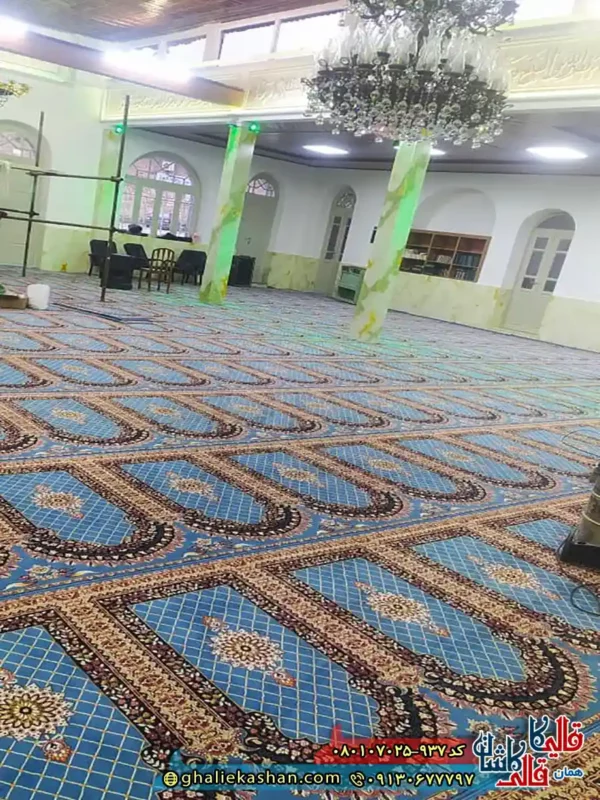 فرش مسجد 700 شانه طرح فردوس رنگ آبی فیروزه ای کاشان