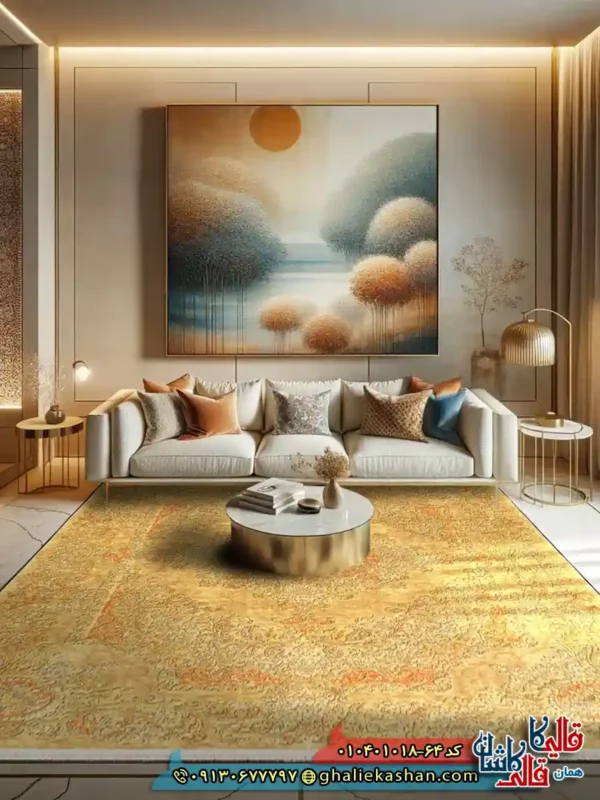 این مدل از محصولات فرش کاشان جزو همان فرش هایی است که هر گوشه آن یک داستان ریز دارد . ترکیب رنگ زرد و نارنجی ، حس گرما و انرژی وارد فضا می کند و طرح یچک ترنج در مرکز کار ، نقطه توجه را کاملاً به خود اختصاص می دهد . ترنجی که ریزنقش های بته جقه درون آن قرار گرفته ، جذابیت طرح را چند برابر کرده است . در قسمت های مختلف فرش نیز گل های گلدانی و نقش های اسلیمی دیده می شوند و همین موضوع موجب می شود فرش هم اصیل باشد و هم دلنشین .