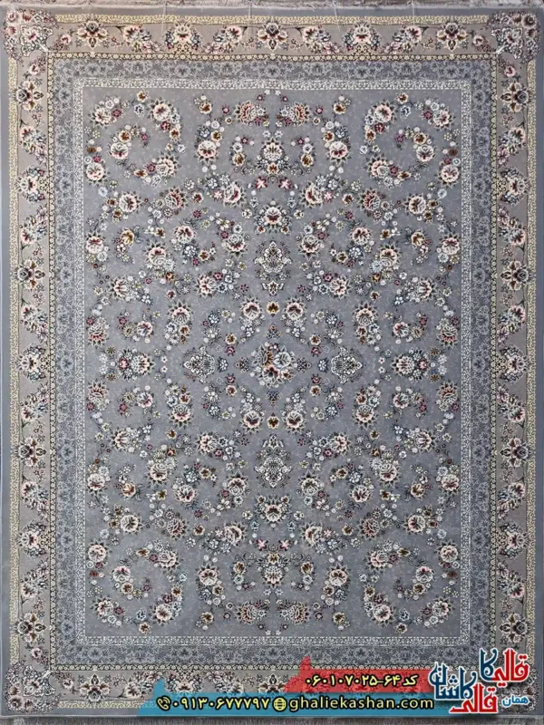 1. فرش کلاسیک 700 شانه طرح افشان ساحل رنگ نقره ای حاشیه ترمه ای کاشان حاشیه