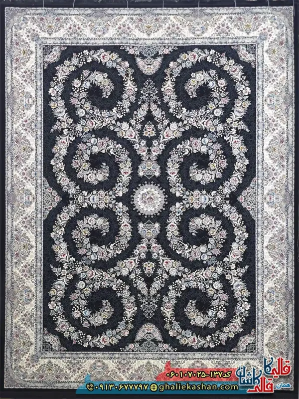 1. فرش کلاسیک 700 شانه طرح افشان شکوه رنگ سرمه ای کاشان حاشیه