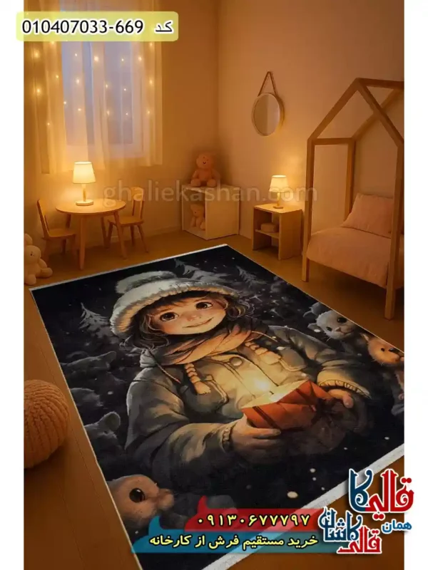 فرش کودک دخترانه طرح دختر برفی رنگ مشکی کاشان نقطه ‌ی کانونی زیبایی برای اتاق کودک است ؛‌ هم به فضا عمق می ‌بخشد و هم حس آرامش و خیال به آن اضافه می ‌کند .‌ حتی زیر نور ملایم شب ‌خواب نیز ، طرح دختر و شمع روی فرش جلوه ‌ی فوق ‌العاده ‌ای دارد .‌