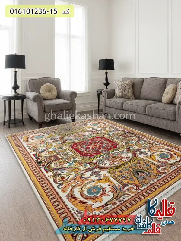 فرش 1200 شانه طرح آدریانا رنگ کرم کاشان دکوراسیون