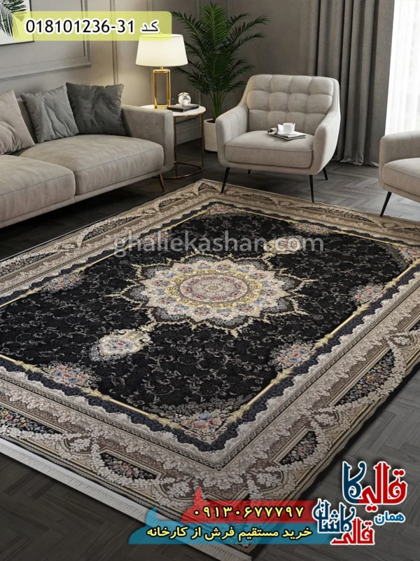 رنگ سرمه ای این فرش با ترکیب رنگ های کرم و طلایی در نقش ها، یک حس سلطنتی و لاکچری به فضای خانه می دهد . در پذیرایی با دکوراسیون کلاسیک واقعا می درخشد و چه کنار مبلمان تیره بگذارید چه روشن، یک تضاد جذاب ایجاد می کند . از آنجایی که طرح آن شلوغ است، فضا را گرم و پررونق نشان می دهد و اصلا اجازه نمی دهد محیط سرد یا بی روح به نظر بیاید .