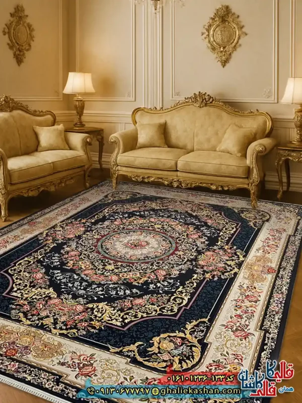 مشخصات فرش 1200 شانه طرح شانار رنگ سرمه ای کاشان