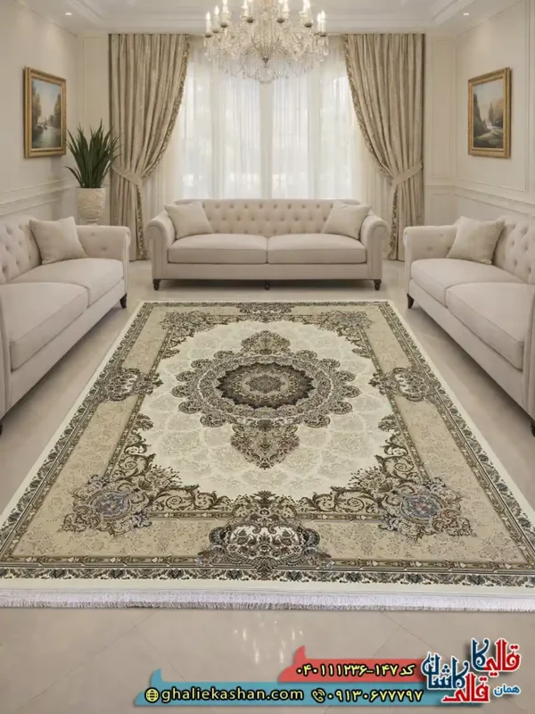 مشخصات فرش 1200 شانه طرح شهرزاد رنگ سفید کرم گل برجسته کاشان