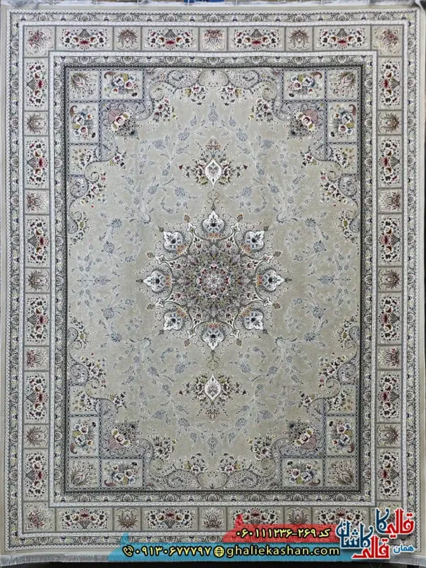ویژگی های طراحی و زیبایی فرش 1200 شانه طرح وانیار رنگ بژ گل برجسته کاشان