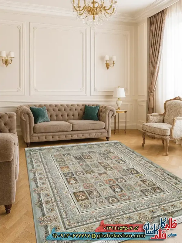 فرش 1500 شانه طرح خشتی رنگ طوسی نقره ای کاشان دکوراسیون