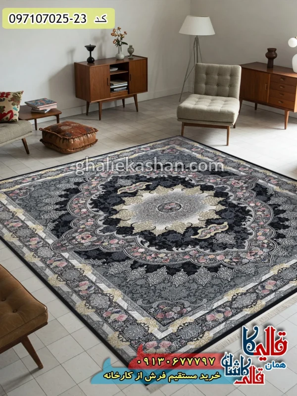 4. فرش 700 شانه طرح آروانا زمینه سرمه ای کاشان نزدیک