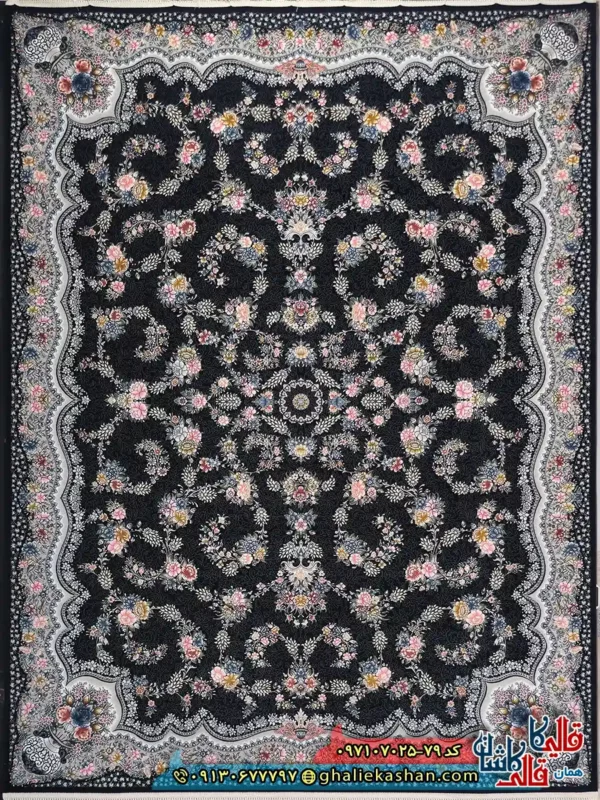فرش 700 شانه طرح افشان رها رنگ سرمه ای کاشان با گل های رز صورتی و زمینه ی سرمه ای چشم گیر ، دکور خانه شما را خاص و با وقار می کند .
