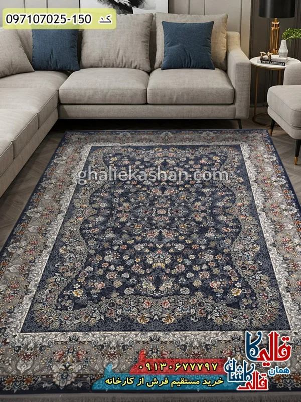 • قیمت خرید فرش قالی کاشان فروش فرش ماشینی 700 شانه طرح باغ معلق زمینه سرمه ای کاشان پادری اصلی