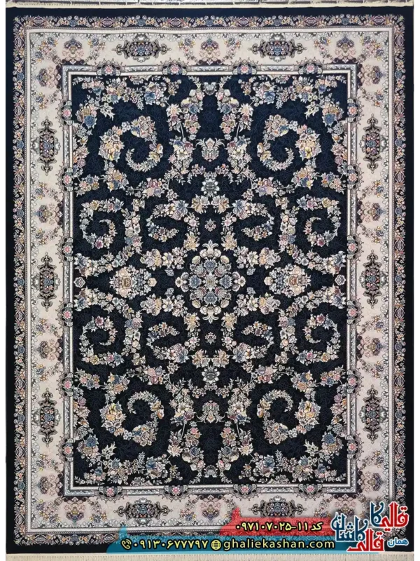 1. فرش 700 شانه طرح افشان نسترن رنگ سرمه ای کاشان حاشیه