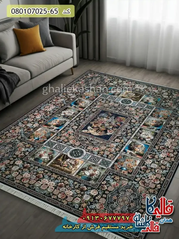 مشخصات فرش 700 شانه طرح باغ ارم زمینه سرمه ای کاشان