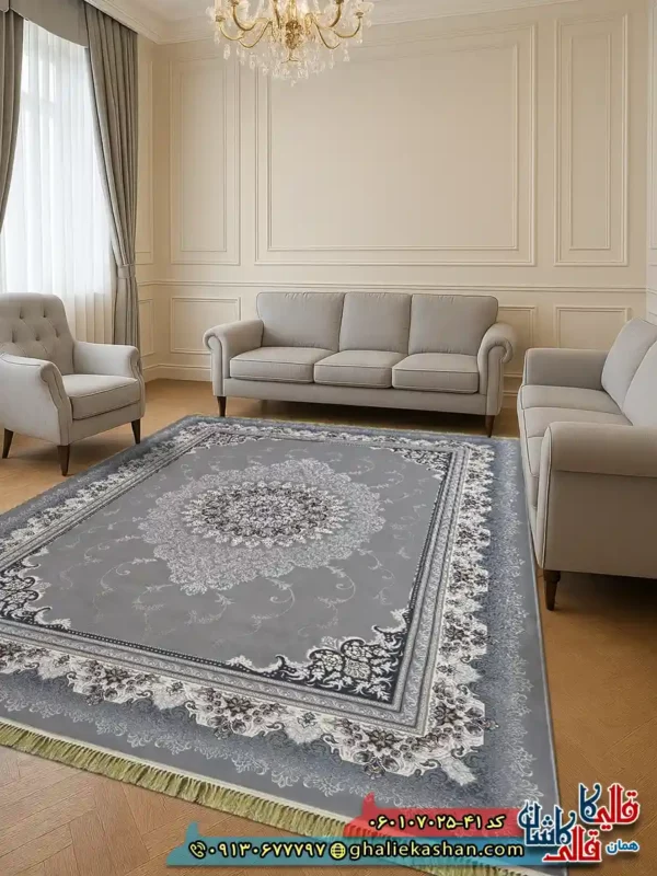 فرش 700 شانه طرح دلاریس رنگ طوسی نقره ای کاشان نزدیک