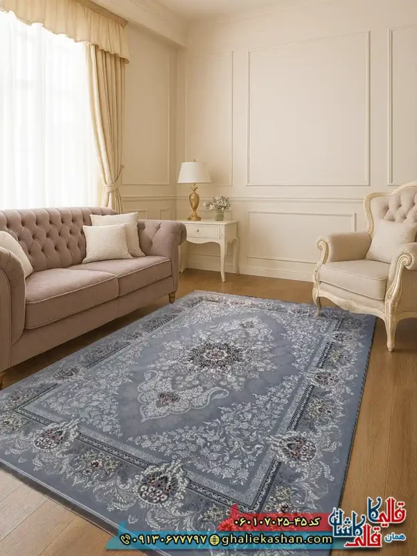 مشخصات فرش 700 شانه طرح دنیز رنگ طوسی نقره ای کاشان